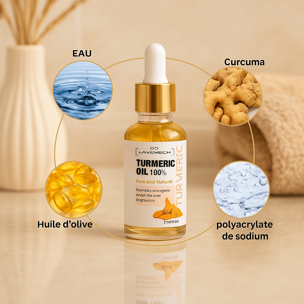 Le Serum Curcuma contient des ingrédients naturels, notamment de l'extrait de curcuma, connu pour ses propriétés éclaircissantes de la peau, ainsi que de l'huile de citron qui nourrit la peau. Ces ingrédients sont entièrement naturels et sans danger pour tous les types de peau.